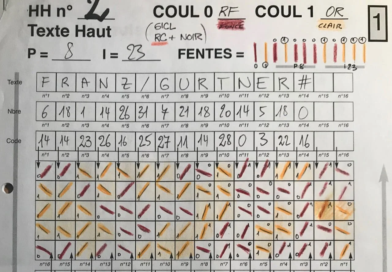 Le texte du MESSAGE EN CLAIR (il s’agit ici du nom du personnage FRANZ GURTNER) a été préalablement crypté par Jean-Claude Bossel de manière a devenir un MESSAGE CRYPTÉ (donc incompréhensible) sur le tableau.