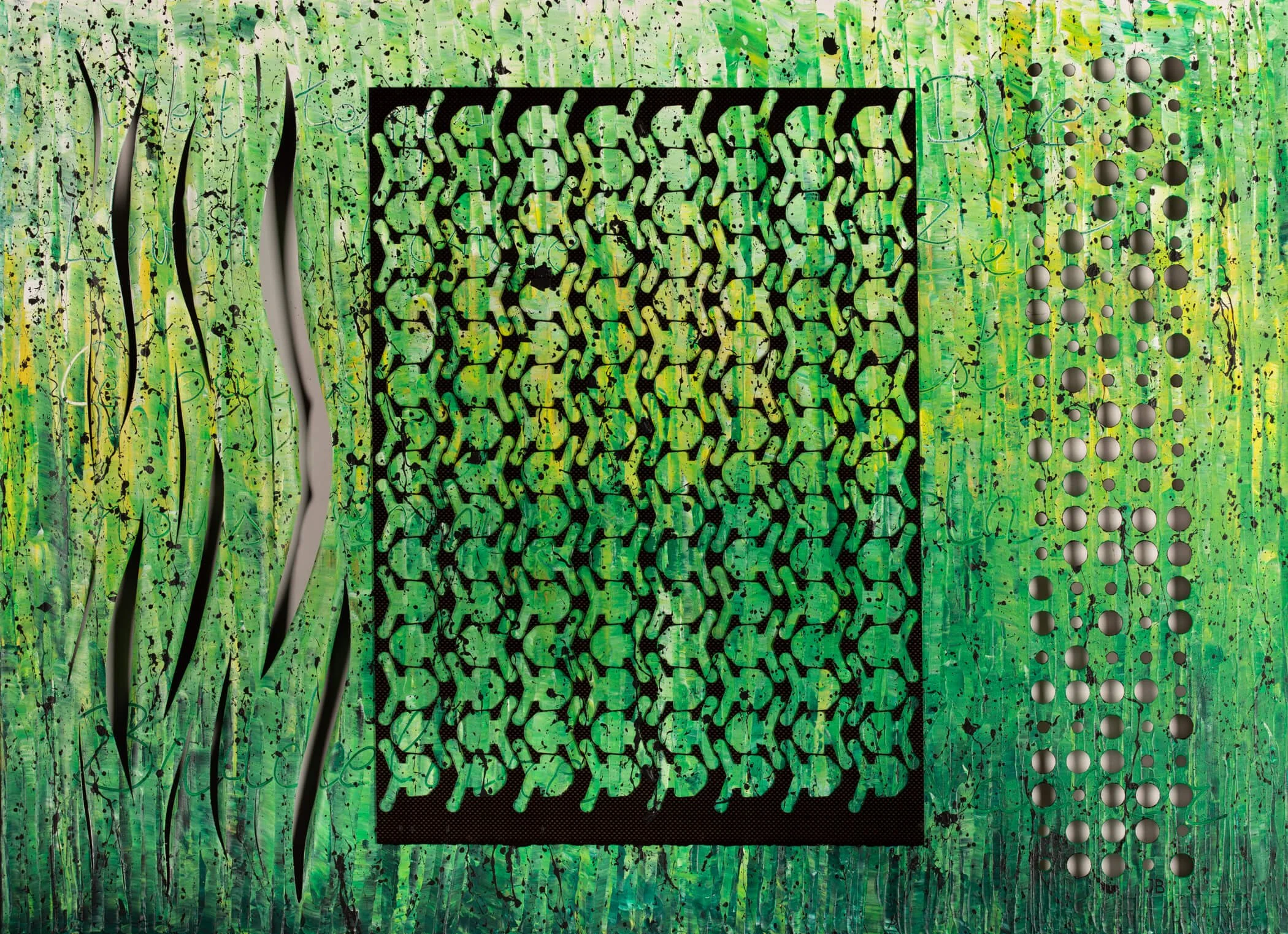 Au bas du tableau, il y a des petits points de couleur dans les mailles d’un treillis métallique.