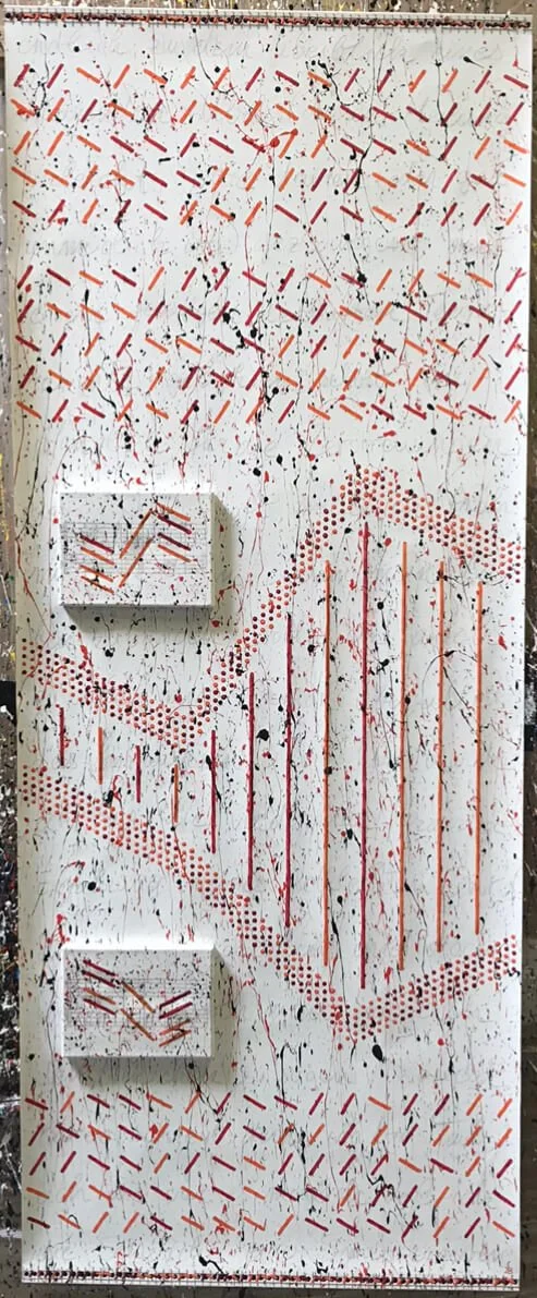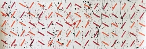 On y remarque des points de couleur orange ou rouge, mais également des traits de couleur (les mêmes couleurs orange et rouge), orientés parfois de manière ascendante (en lecture de gauche à droite), parfois de manière descendante.