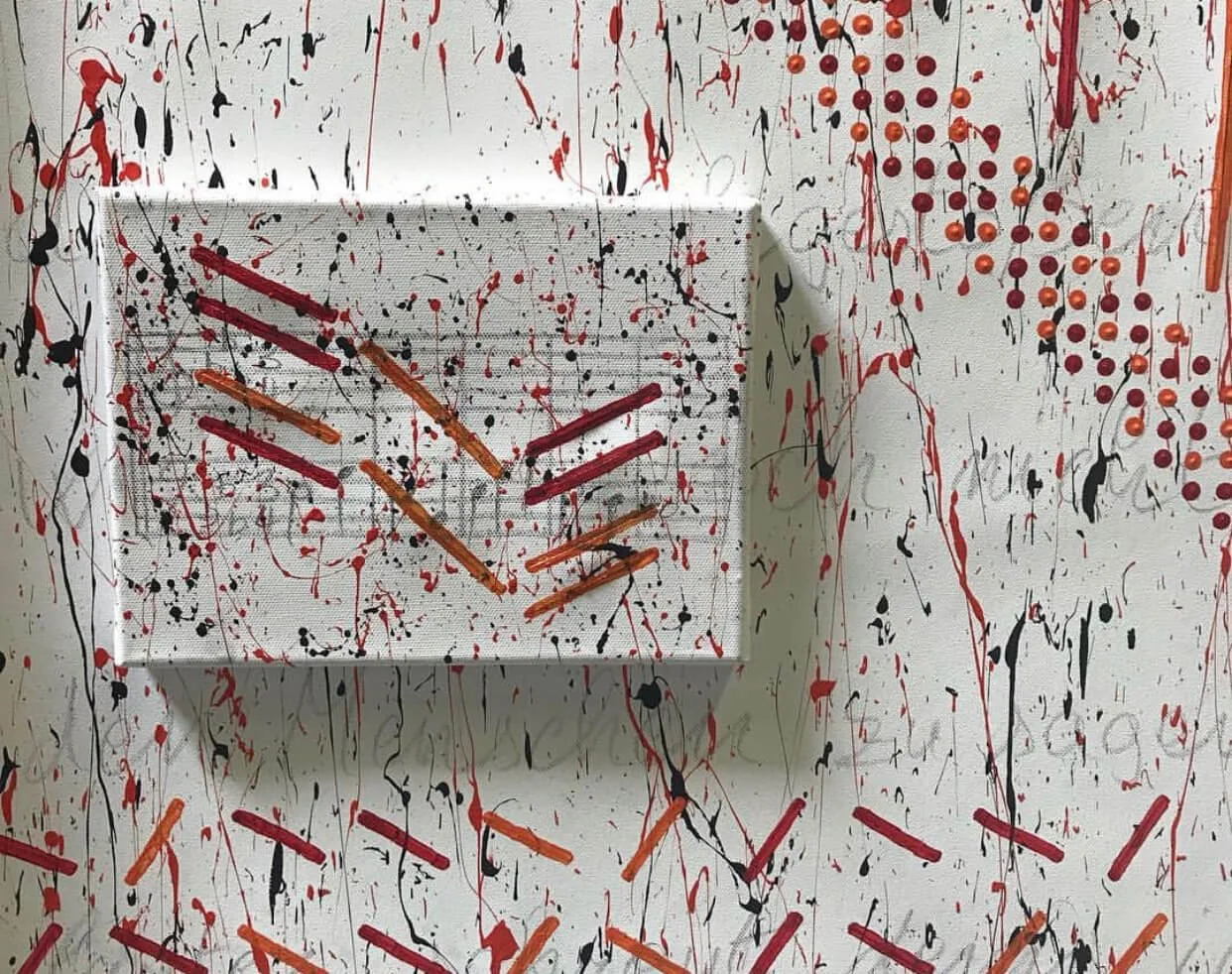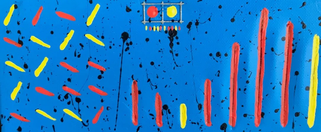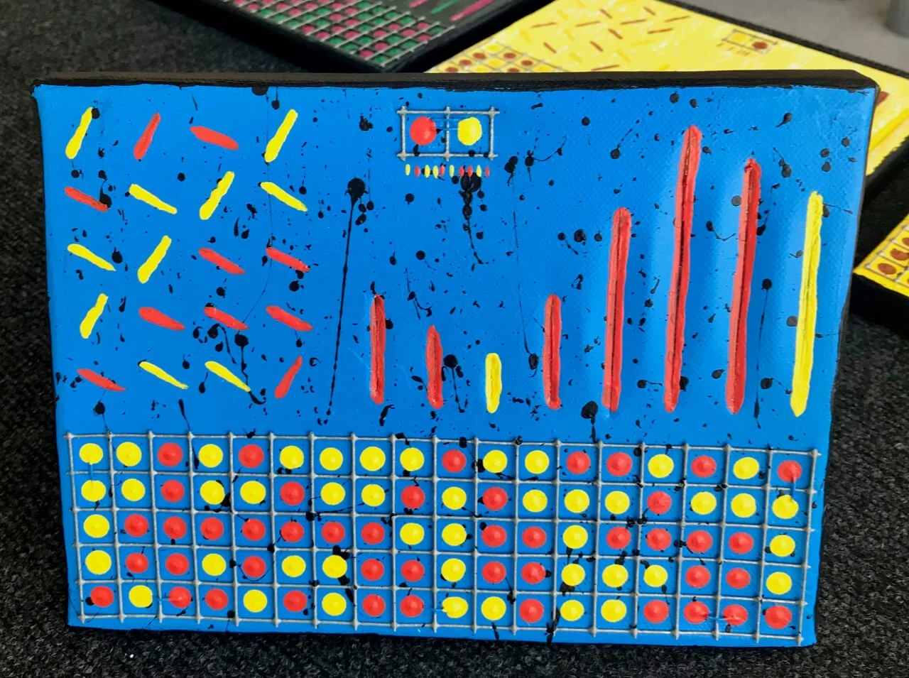 En plus de la couleur de fond bleue et des giclures noires, il y a deux couleurs principales sur ce tableau : le rouge et le jaune. Ces deux couleurs vont symboliser les deux chiffres du système binaire, le 0 et le 1.