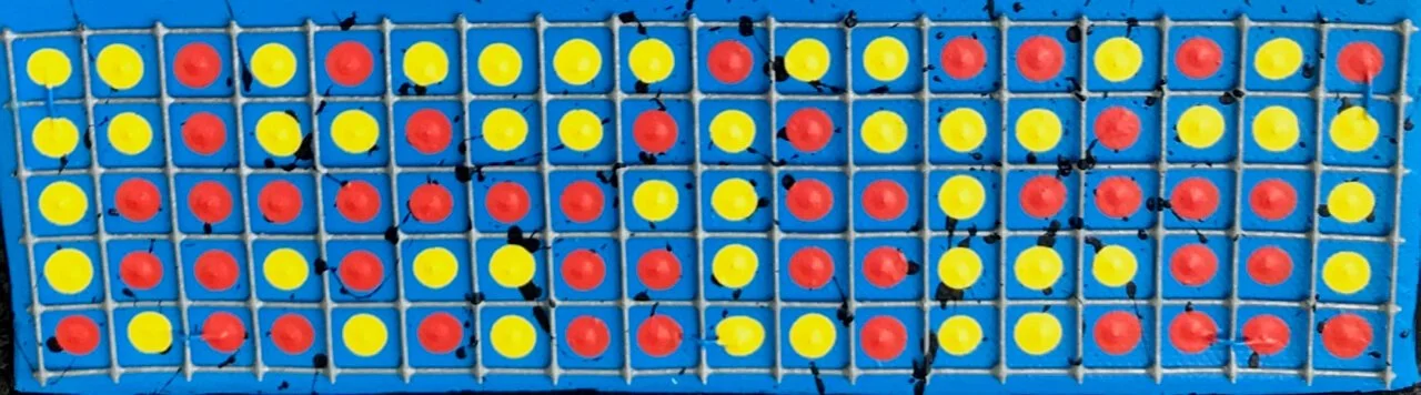 Les deux points situés en haut du tableau au centre (dans un petit bout de treillis) nous indiquent, par leur ordre d’apparition de gauche à droite, que le rouge (le premier point) symbolisera le chiffre 0 et que le jaune (en tant que second point) symbolisera le chiffre 1.