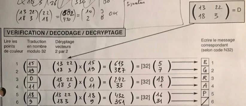 Pour pouvoir transformer ce MESSAGE CRYPTÉ (qui est donc la séquence de nombres décrite ci-dessus commençant par 14-14-23-26-etc) en une nouvelle séquence de nombres permettant de lire le MESSAGE EN CLAIR, il faut connaître la matrice de décryptage (une matrice de Hill d’ordre 2, donc quatre nombres à connaître).
